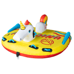 The Unicorn is a 3 rider towable tube built for fun days on the lake. The Unicorn can handle up to 3 riders but it can be ridden by 1, 2 or 3. The center rider sits on the deck of the tube while the outside riders lay in the prone position. Built with only the finest materials and guaranteed with our 1 year warranty, this tube will keep you where you want to be…on the water.